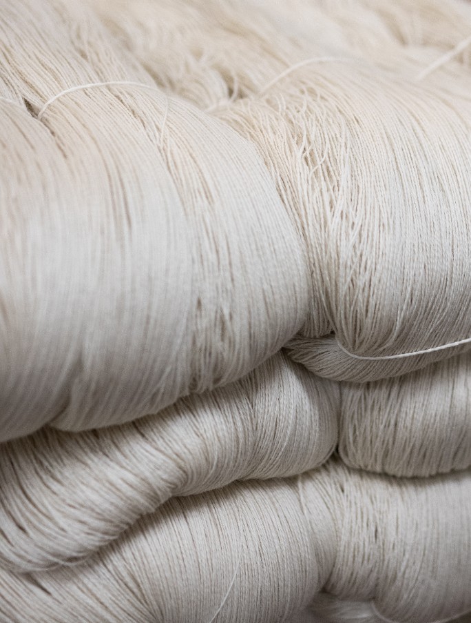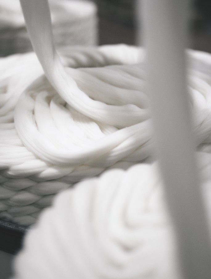 Á þessum stað í framleiðslunni er bætt við hráefnum . Í þessum risahespum er ull sem hefur verið þvegin og kemd. Þegar um er að ræða litun á miklu magni í lotunúmeri, litum við heilu hespurnar áður en þær eru spunnar í dokkur.