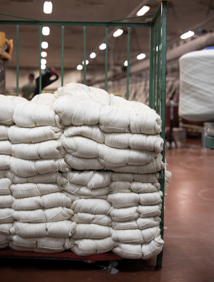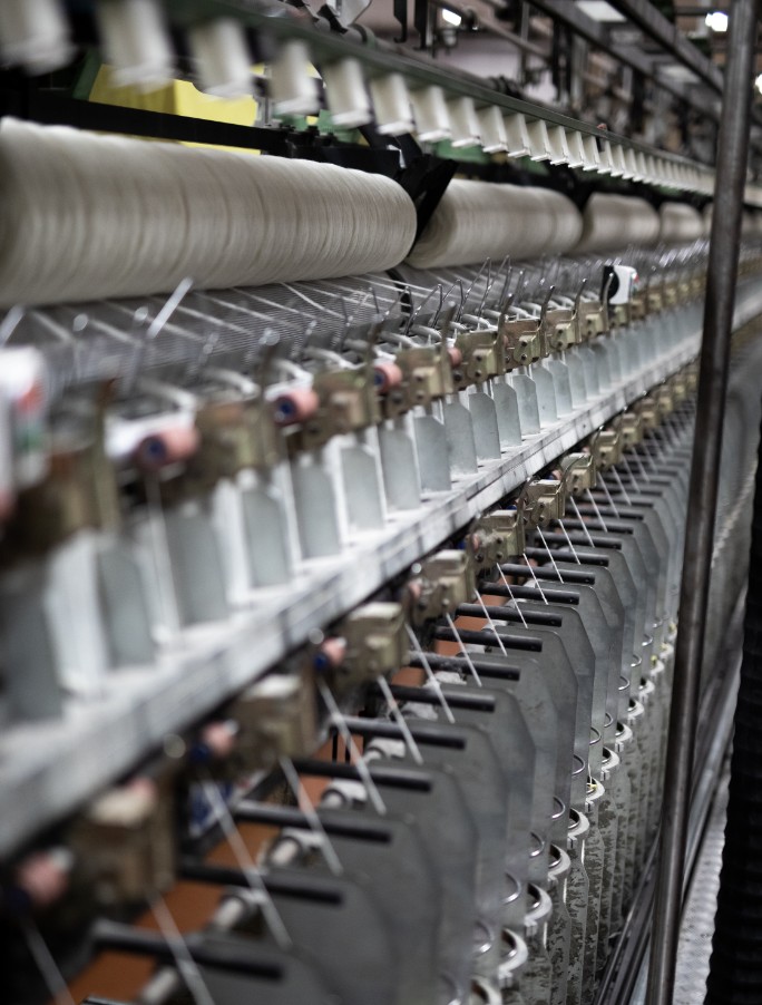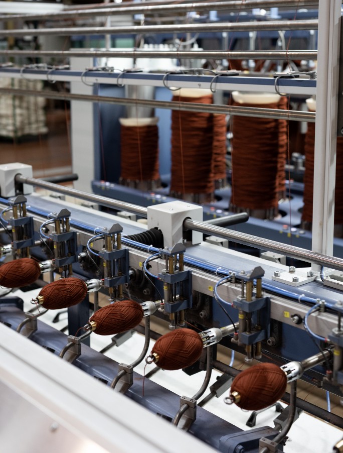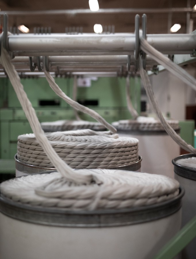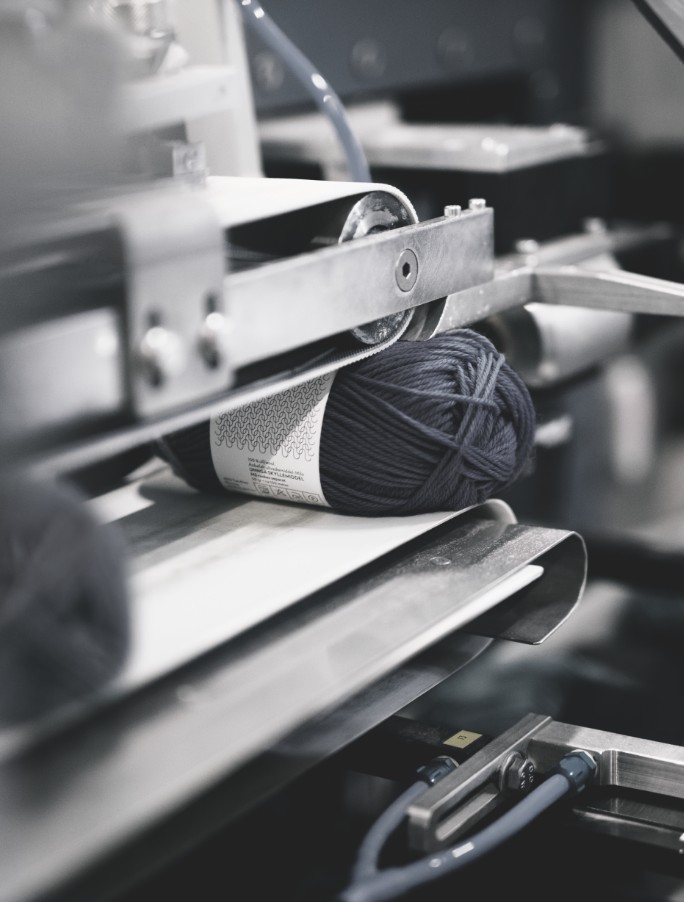 Hespuullin fer beint í spinningu/dokkuvélina. Við erum með 4 vélar sem búa til dokkur, líma borða á dokkurnar og pakka þeim í 1kg poka.